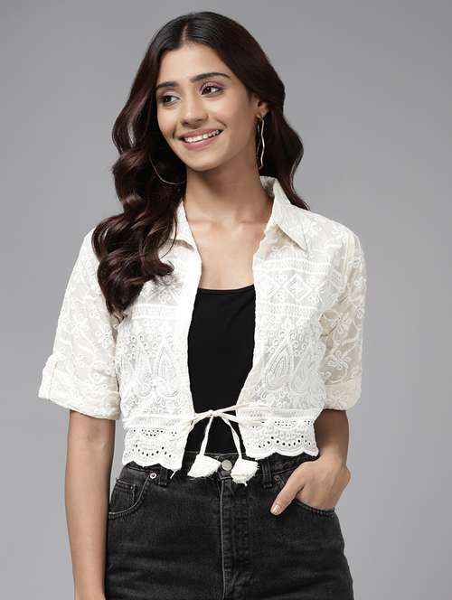 - Spread the magic of your eccentric beauty with ethnic shrugs made of light-weight lace material to lift up your look effortlessly.