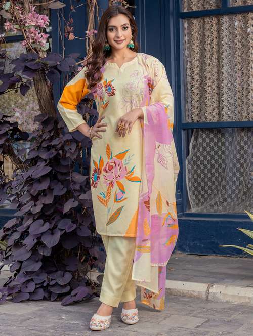 • Find gorgeous sets of ethnic wears in trending designs in cream colors suitable for casual wear of occasions.