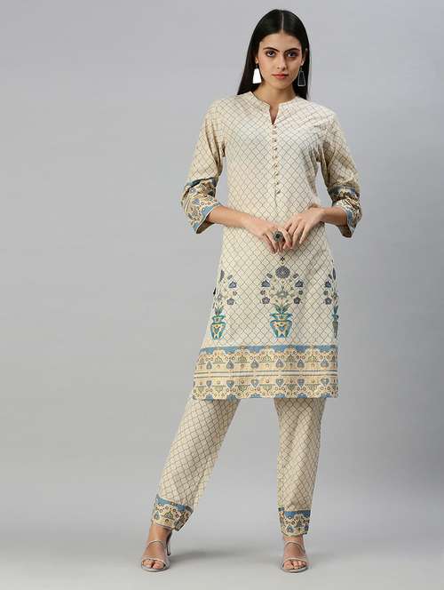 - Find gorgeous sets of ethnic wears in trending designs in cream colors suitable for festive wear of occasions.