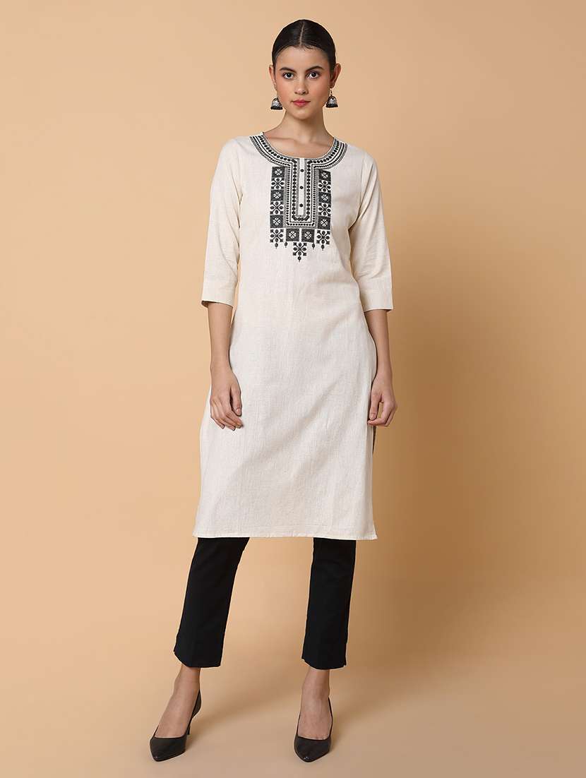 • Grab this beautiful kurta made up of cotton blend fabric featuring round neck designs.