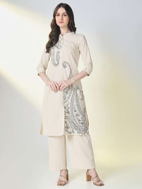 - Find gorgeous sets of ethnic wears in trending designs in off white colors suitable for casual wear of occasions.