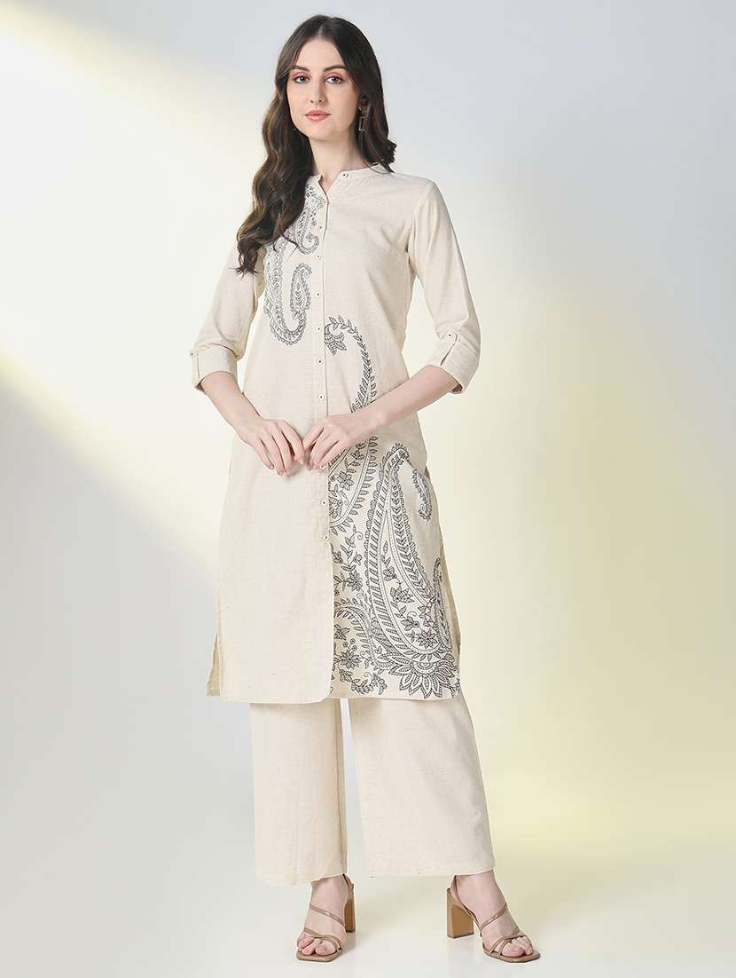 - » women off white roll up sleeve kurta palazzo set