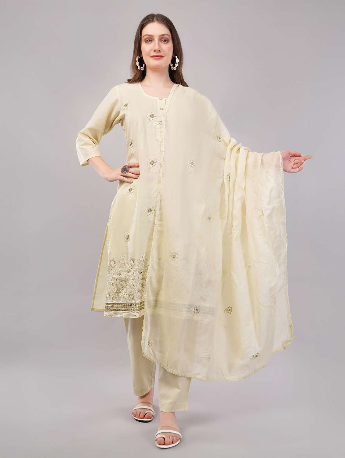 • Find gorgeous sets of ethnic wears in trending designs in cream colors suitable for casual wear of occasions.