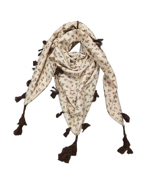 Add a touch of vintage charm to your wardrobe with this exquisite square scarf featuring a delicate floral print pattern. The cream-coloured cotton fabric serves as the perfect canvas for the scattered small flower motifs in subtle, harmonious hues. Measuring 100x100 centimetres, this versatile accessory is adorned with elegant brown tassel fringe detailing along all edges, adding movement and sophistication to its classic design. The lightweight cotton material makes it comfortable for year-round wear, whether draped around your shoulders, styled as a neck accessory, or used as a decorative piece. The timeless combination of the dainty floral print and traditional tassel embellishments makes this scarf a charming addition to both casual and formal ensembles. The square shape offers multiple styling possibilities, allowing you to create various looks with this versatile piece.