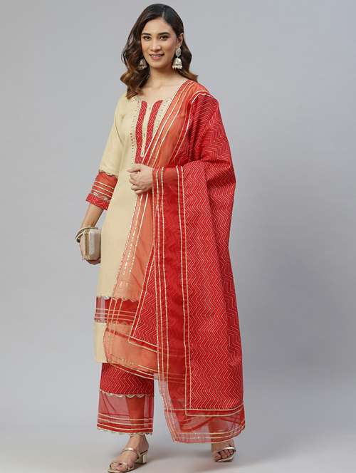 cream self design kurta palazzo set with dupatta  - 19473153 - Very Small Image - 1