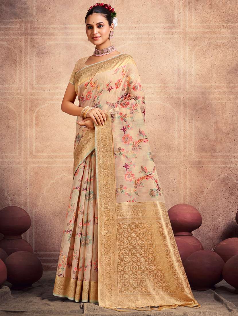 - » women beige floral printed bordered saree with blouse