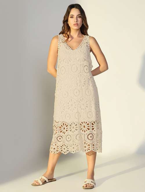 SHOWOFF Edition Women's Cream Solid A-Line Crochet Dress