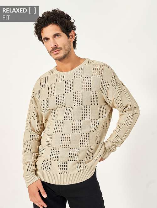 Men Checkered Crochet Knit Relaxed Fit Crew Neck Sweater