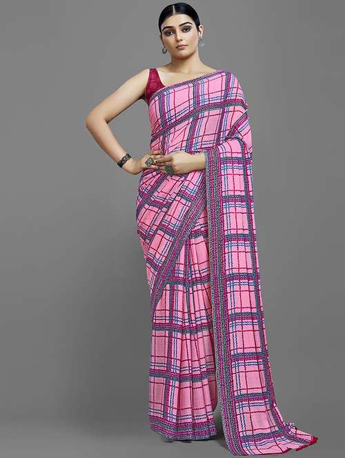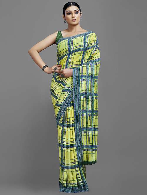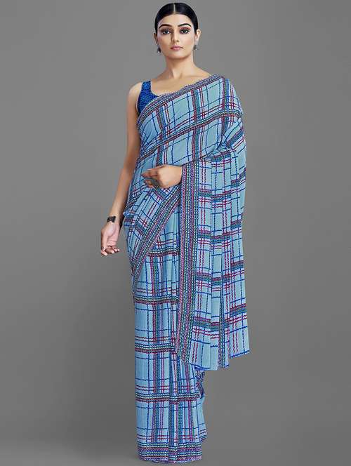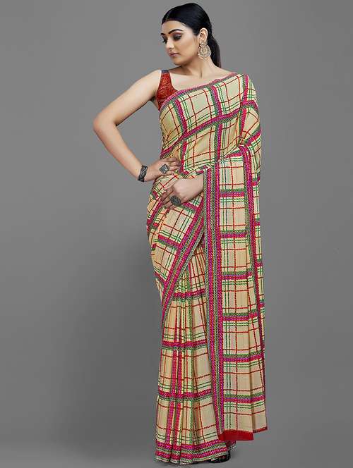 Unique splendor comes out from your dressing style and design with this cream georgette trendy saree. This engaging attire is showing some superb checkered printed work. Comes with matching blouse.