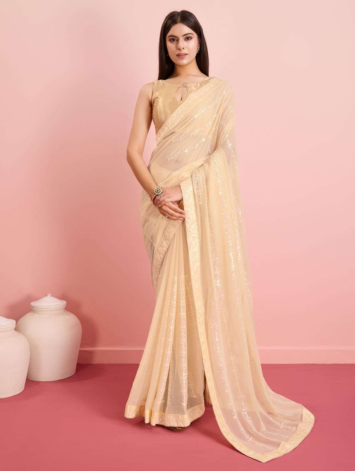 - » women cream embroidered saree with blouse