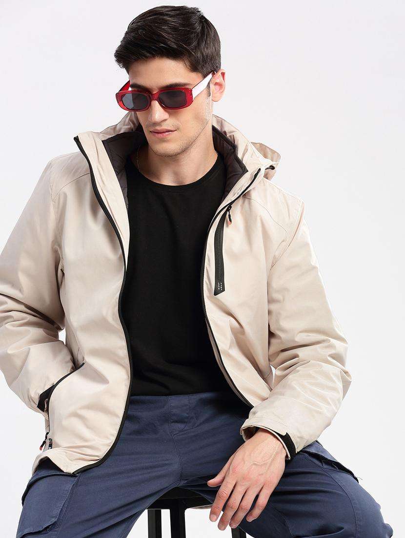 SHOWOFF Men's Hooded Cream Solid Tailored Oversized Jacket comes with Detachable Hoodie and Inner Jacket