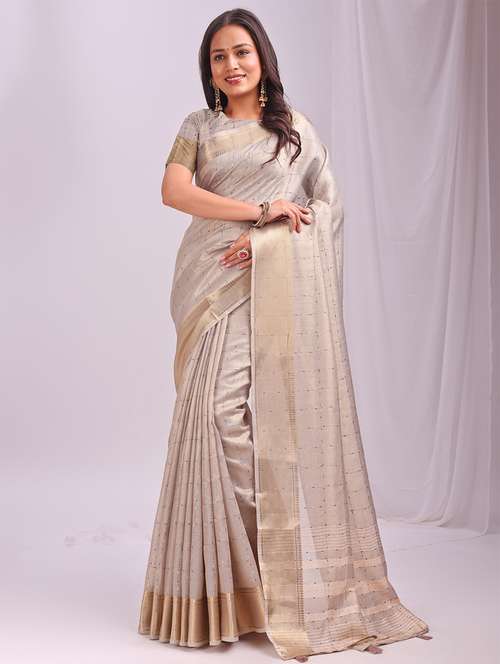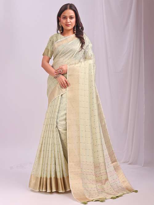 A cream gold organza saree adorned with soft golden zari weave, exuding grace and class. Lightweight, breathable, and ideal for weddings, receptions, or cultural occasions.