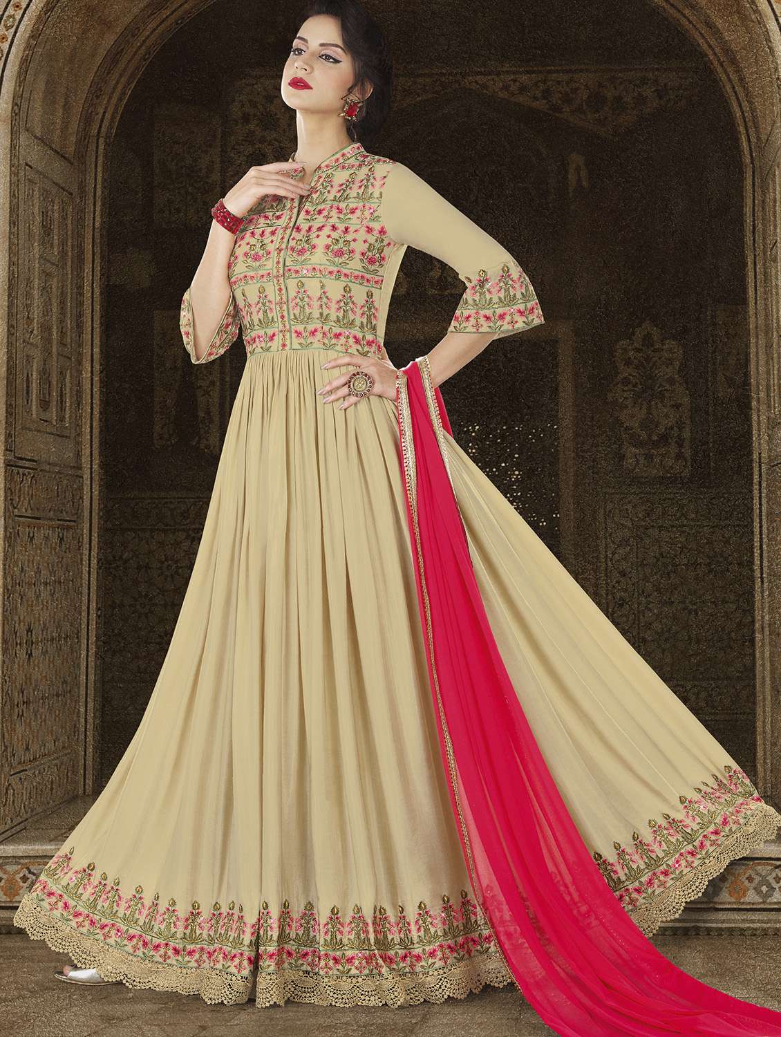 - » cream embroidered semi-stitched anarkali suit