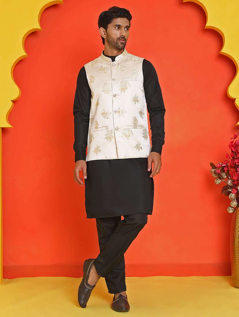 Cream Embossed Silk Blend Nehru Jacket With Solid Kurta Set.Black straight knee length kurta, has a mandarin collar, long sleeves, straight hem, Black solid churidar, drawstring closure,