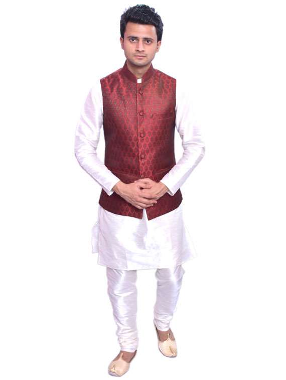 - » cream silk blend kurta pyjama with jacket ethnic wear set