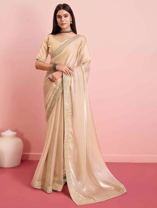 Cream colored saree is made from jimmy choo (tissue) fabric which is highlighted with beautiful solid with sequins embroidered work as shown. Comes along with unstitched mono banglory blouse piece which you can customise as per your design/style.