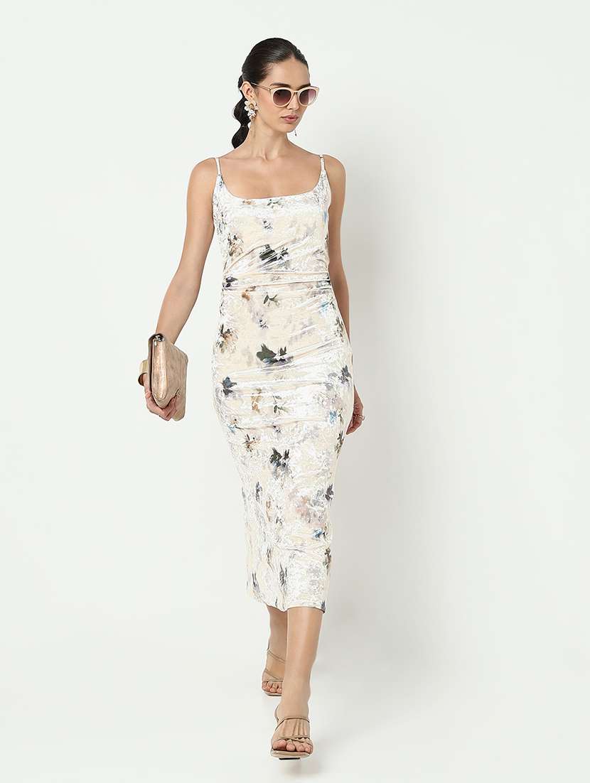 SHOWOFFFF Edition Women's Floral Cream Velvet Bodycon Maxi Dress with Back Slit