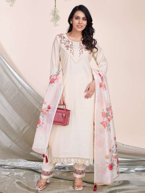 - Find gorgeous sets of ethnic wears in trending designs in cream colors suitable for festive wear of occasions.