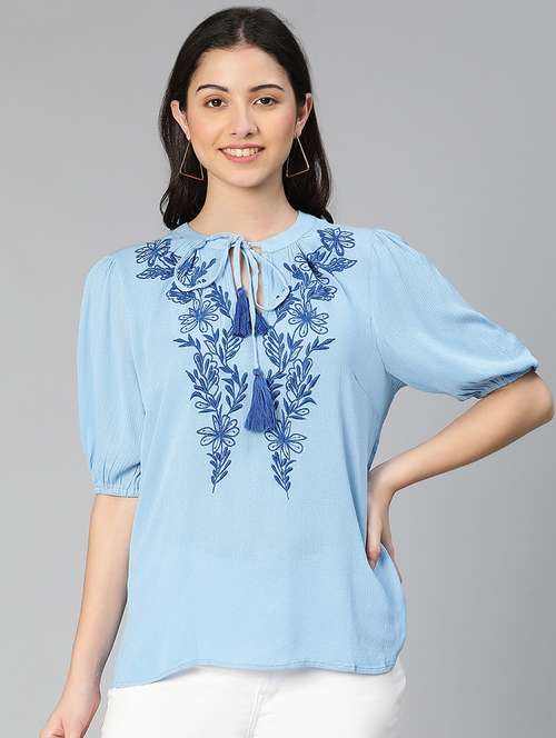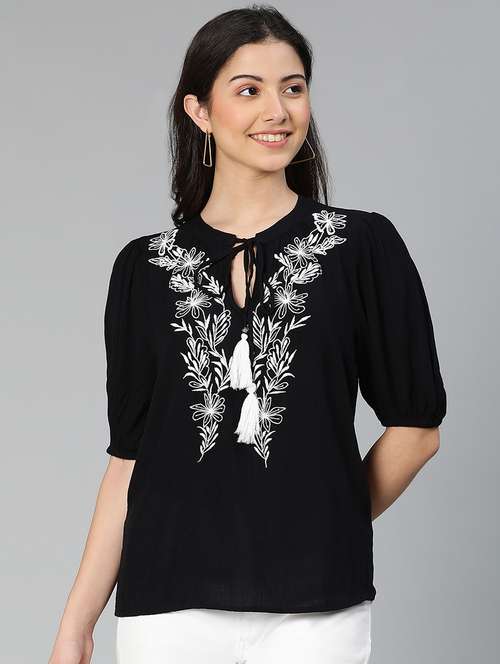 - Opt for this top made up of viscose material and get it in a varied neck design.