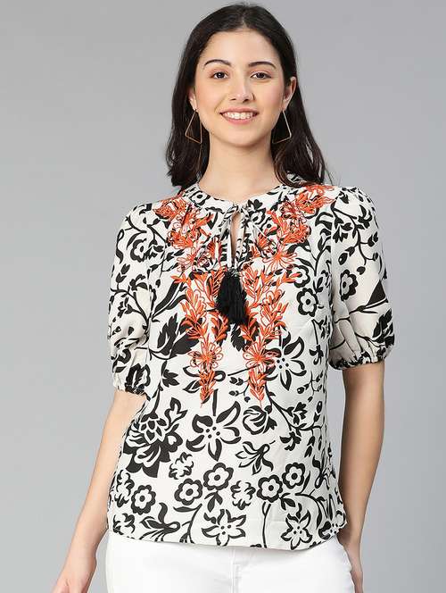 The off-white floral print & embroidered women's casual top is beautifully designed with sustainable viscose fabric and has a stylish and super fashionable look. It is fashioned with an over-floral print along with embroidery in the front around the neck, a round neckline along with a tie-knot thread, short elasticated sleeves, and a round hem with a length to the waist. Pair it with nice-looking bottom wear to get the complete look for basic days to party days.