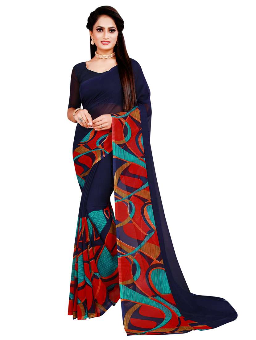 - » dark blue printed georgette saree with blouse