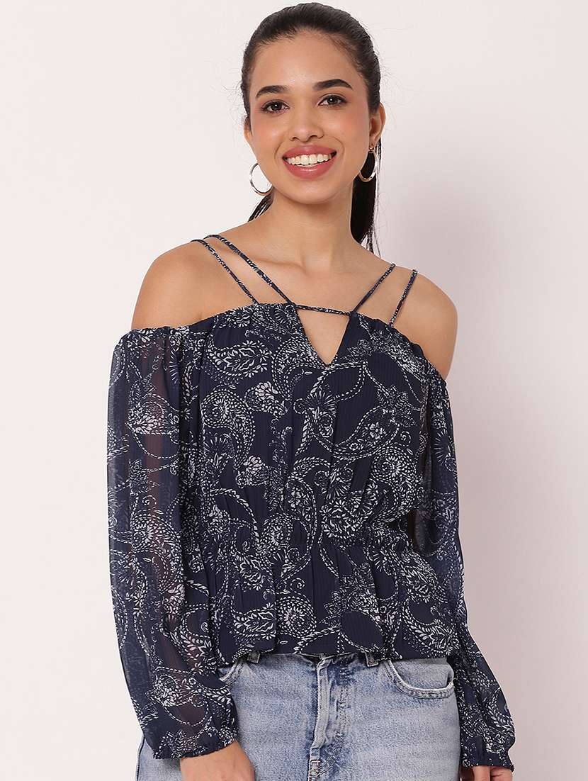 - Opt for this top made up of poly georgette material and get it in a varied neck design.