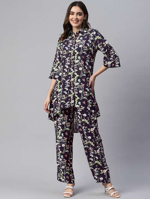 Navy blue and white printed tunic, has a shirt neck, three-quarter sleeves,
