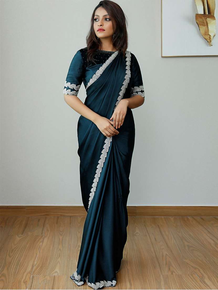 solid satin saree with embroidery on border with blouse