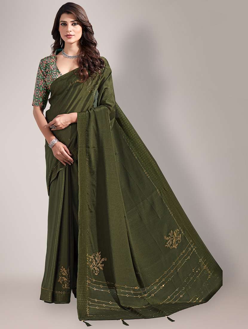 Vogue and trend could be at the peak of your magnificence the moment you attire this dark green (mehendi) colored saree. This saree is made of moss chiffon fabric which is highlighted with beautiful swarovski embroidered work as shown. This saree is comfortable to wear and care all day long. Paired with unstitched satin fabric blouse piece which can be stitched as per your choice and requirement. You can wear this saree for parties, functions, occasions and other homely events. Pair it with traditionally stylish accessories to complete the look. Note:- The actual product may differ slightly in color and design from the one illustrated in the images.