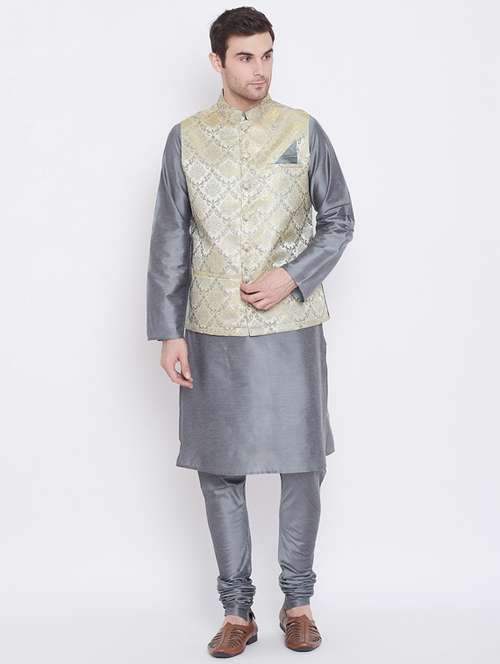 - » grey solid silk blend kurta pyjama set with jacquard nehru jacket