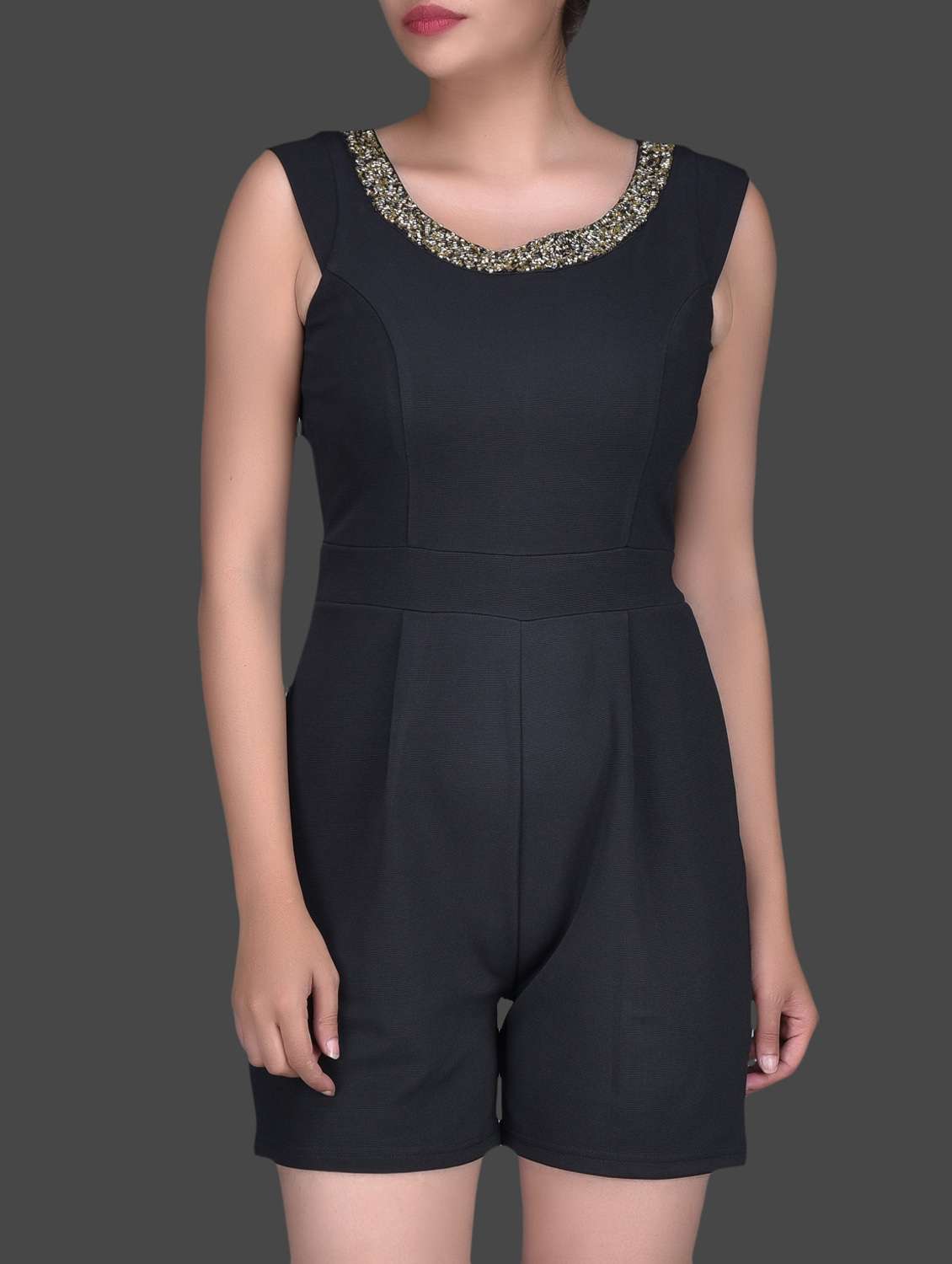 embellished black cotton knit sleeveless romper