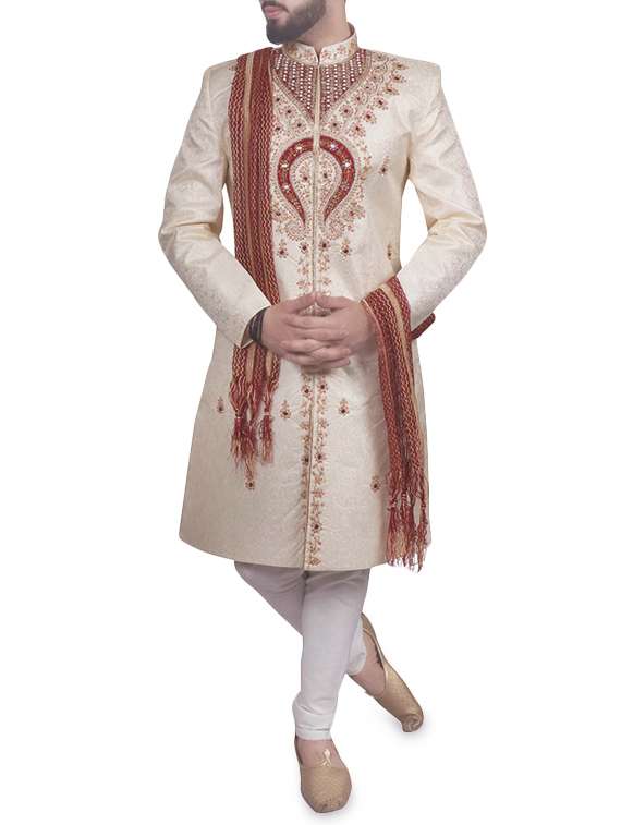 beige polyester sherwani set - 16180951 - Very Small Image - 1