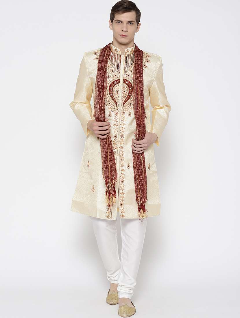 gold embroidered silk blend sherwani set
