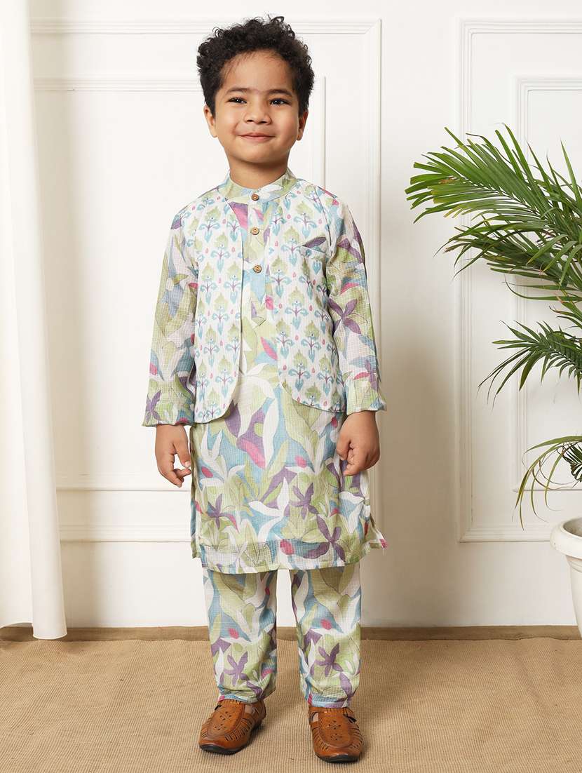 boy multi colored printed kurta set with nehru jacket
