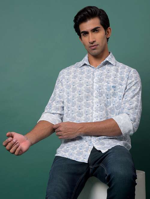 - Men White & Blue floral printed casual shirt from United Colors of Benetton is the best shirt with unique small flower prints all over. Opt for camel shade chinos to rock the attire at the part. Keep the sleeves rolled up to the elbow length.