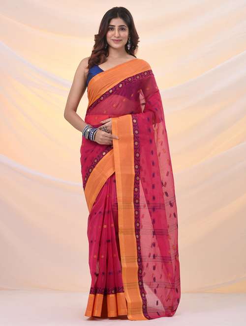 Get a poised and dainty look in this fuchsia pure cotton tant saree. It has woven designs and patterns all over for a beautiful look.