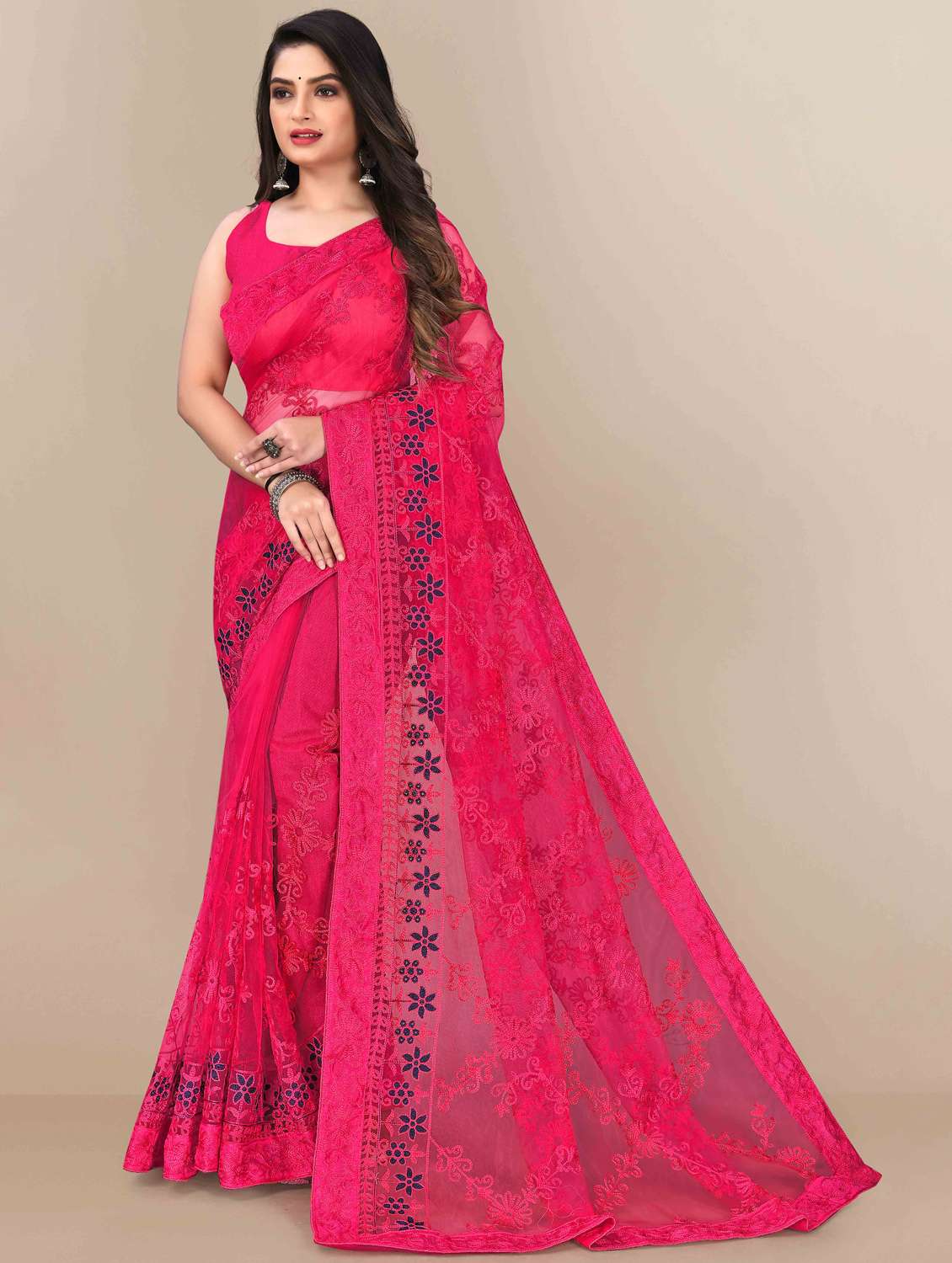 This striking dark pink saree crafted in delicate net fabric. The saree is embellished with rich floral embroidery, adding a festive charm and graceful flair to your look. The soft net material offers an elegant fall and light texture, making it perfect for long hours of wear. It comes with a matching unstitched jacquard blouse piece, allowing for personalized styling to suit your taste.