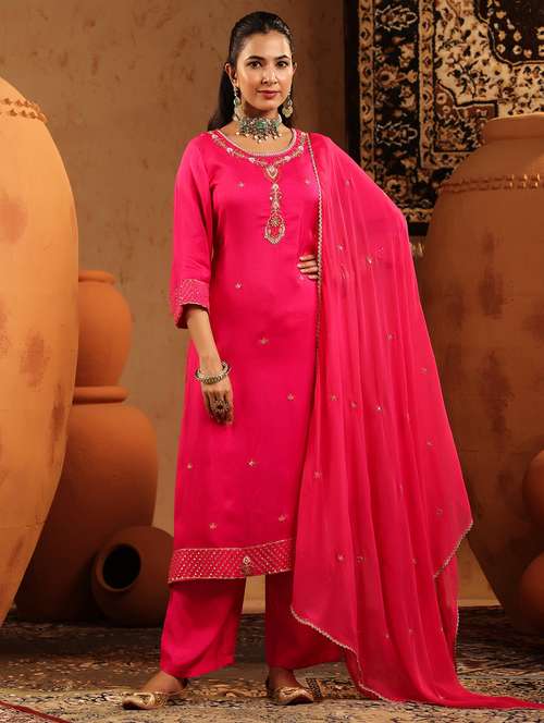 women embroidered three quarter sleeve kurta pant with dupatta set