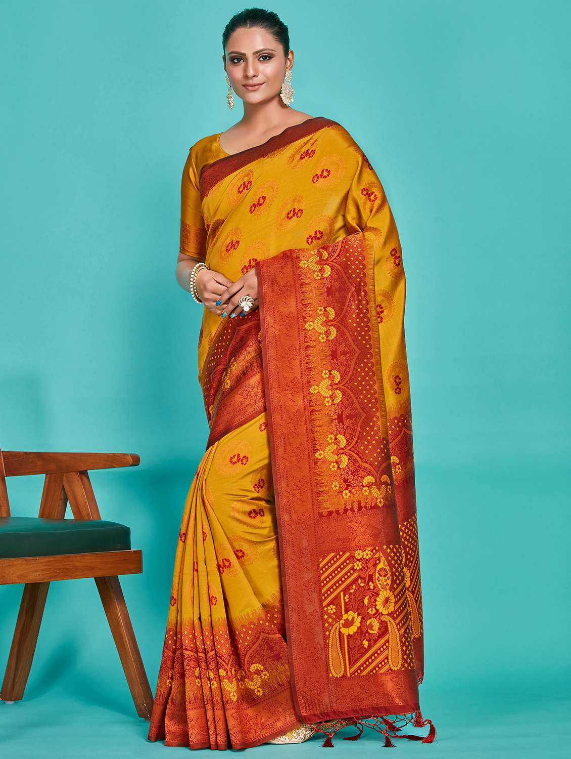 women's self design mustard colored saree with blouse