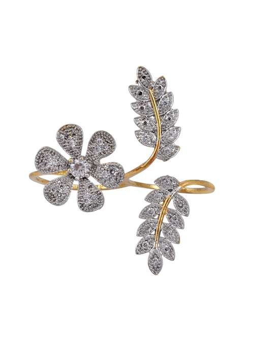A stylish ring for women, made with Gold plated brass, and studded with Pave set Cubic Zirconia. Sparkling white CZ studded in form of flower and leaf makes it look elegant. Twin finger ring, is stylish, and looks so graceful, with your other jewellery.