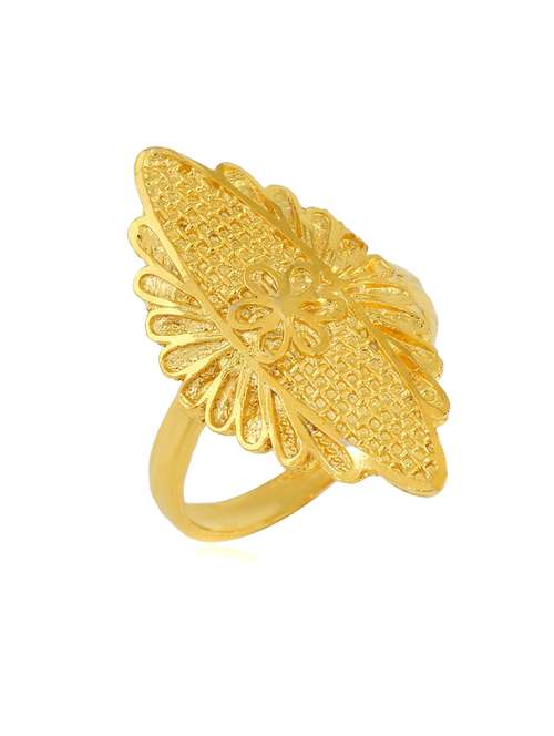 A super finish, exquisite filigree work, Marquoise shape finger ring for Women. Elegant long design, which covers the major part of length of finger. Made using compuetrr guided CNC machines, the fine filigree work comes out with exquisite perfection. Made in Brass, the ring is further given a genuine 1 Micron Goldplating, which makes this ring to look exactly like real Gold finger ring, It matches well with all your other jewellery. Combines fashion with Tradition, this can be worn at all occasions. A good partywear, marriage, college, travel wear, and makes a good gifting option as well to Women