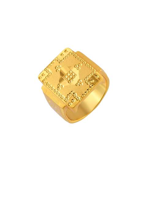 Make a bold statement with this exquisite 24KT micron gold-plated brass ring for men. This handcrafted masterpiece features an elegant square-shaped design with intricate dotted patterns that create a sophisticated and timeless appeal. The ring's substantial appearance mimics the look of solid gold jewellery, making it perfect for special occasions like engagements and weddings. The meticulous craftsmanship ensures a premium finish that catches light beautifully, while the comfortable fit makes it suitable for everyday wear. This 1-gram ring combines traditional aesthetics with contemporary styling, offering a luxurious appearance without the premium price of solid gold. The durable brass base ensures longevity, while the gold plating adds a rich, warm lustre. Whether paired with formal attire or casual wear, this ring serves as a versatile accessory that elevates your style quotient. Please note: This is a gold-plated item and requires appropriate care to maintain its shine.