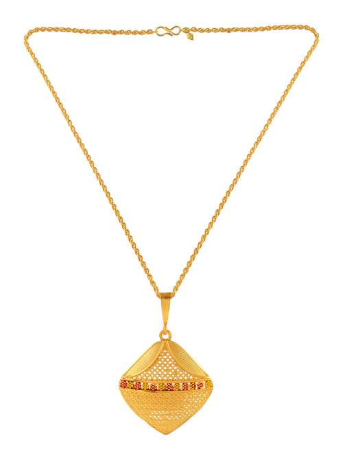 Add a touch of traditional elegance to your jewellery collection with this exquisite kite-shaped pendant with chain . Crafted with precision using 24KT micron gold forming on brass, this stunning 1-gram piece showcases intricate handmade red meenakari work that brings a vibrant pop of colour to the design. The pendant features a sophisticated combination of textured patterns, including delicate filigree work and a mesmerising geometric layout. The beautiful rope chain complements the pendant perfectly, making it a versatile accessory for both everyday wear and special occasions. The pendant's unique kite shape and detailed craftsmanship make it stand out, while its lightweight construction ensures comfortable wear. This piece beautifully merges contemporary style with traditional Indian artistry, making it an ideal choice for the modern woman who appreciates cultural aesthetics.