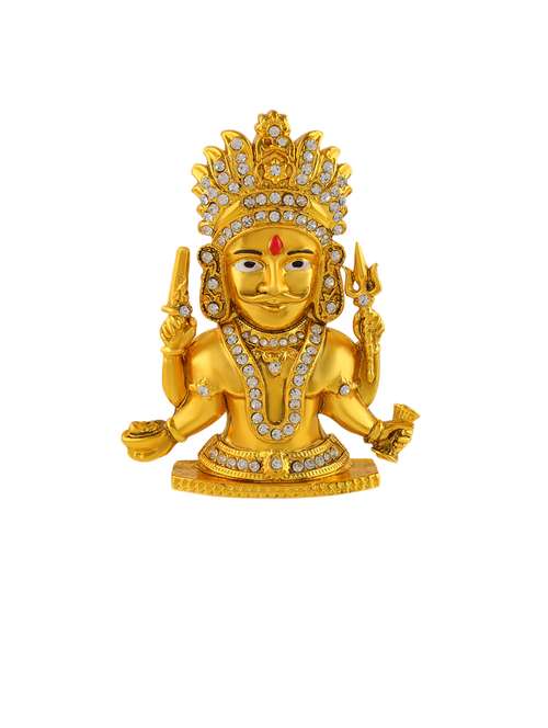 Brass Gold plated exact same look replica of Nakoda Bhairavji, a most respected and worshipped Jain gold diety. Worshipped by all Jain sects (DIgamber and Shwetambar, the deity is widely beelived to fulfill all wishes, and remove all obstacles and negative energies in ones life, quite quickly. Nakoda is a small town near Jodhpur in Rajathan, where a magnificient temple is dedicated to Nakoda Bhairav ji. This superbly created replica idol is downsized to scale, and superbly made with aesthetic appeal, by skilled Jain craftsmen from Rajasthan to maintain sanctity. Attractive CZ studded 4 Inch hieght idol is lovely to look at, it gives a feeling of religeous inspiration and motivation. Handcrafted with superfine filigree work, the dimensions are downsized to perfection. An exclusive piece of Idol Stand to keep at home temple Puja, office, shops or work places. A superb gift to Jains at any occasion.