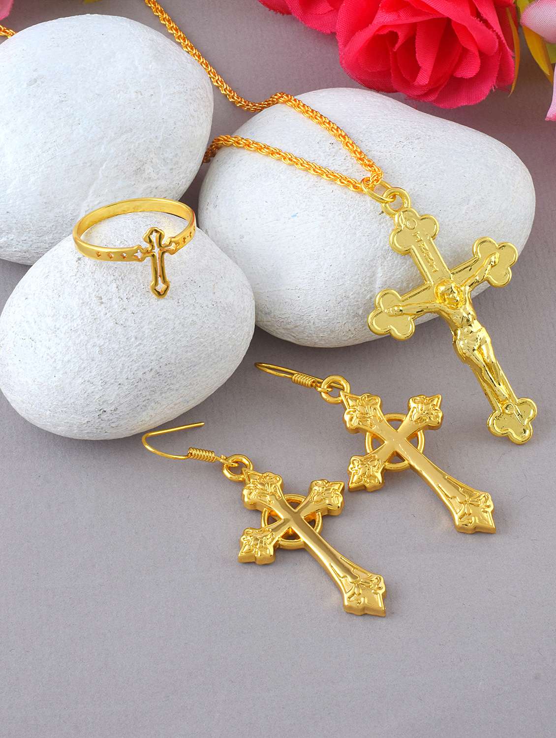 Elevate your spiritual expression with this exquisite Christian jewellery set featuring distinctive combo of one Crucifix Cross pendant, Earrings and a matching ring. Crafted from brass with premium micron gold plating, each piece showcases unique artistry in its design. The set includes a beautifully detailed crucifix pendant on a rope chain, complemented by a pair of ornate cross Earrings with flourishing Gothic-inspired details. The free size Cross ring features a graceful cross motif that harmonises perfectly with the pendants. Each piece weighs approximately 32 grams and exhibits meticulous craftsmanship in the intricate detailing. The versatile unisex design makes it suitable for both everyday wear and special occasions. The pendants and ring are fashioned with durability in mind, making them ideal for long-term wear. This thoughtfully curated set arrives beautifully packaged, making it a meaningful gift choice for religious celebrations or as a personal spiritual accessory. Care instructions: Store separately in a cool, dry place and avoid contact with harsh chemicals to maintain the lustre.