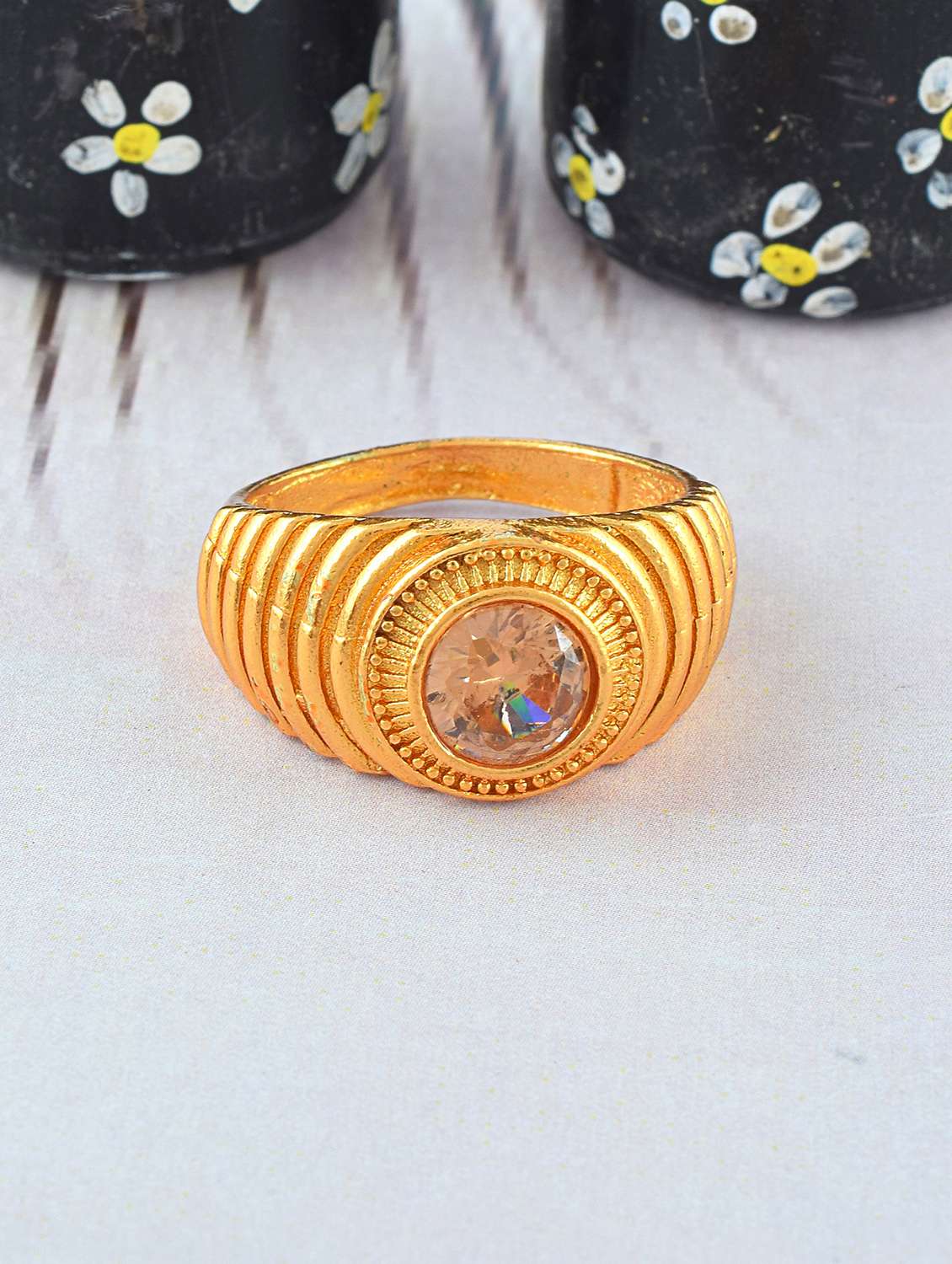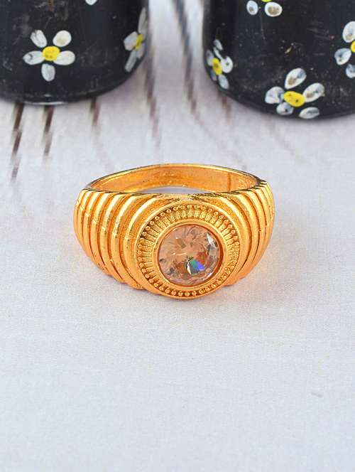Make a bold statement with this exquisite men's ring featuring a stunning Natural Gemstone-Yellow quartz centrepiece. The ring showcases a 12mm round facetted gemstone in charming pale yellow shade, set in a sophisticated ribbed design crafted from brass with micron gold plating. Weighing just 4 grams, this lightweight yet eye-catching piece combines elegance with comfort. The distinctive sunburst pattern surrounding the stone adds a royal touch, while the stepped ridges along the band create a dynamic, contemporary look. The ring's versatile design makes it suitable for everyday wear, seamlessly complementing both traditional and modern attire. Its one-size design features a durable brass construction that maintains its lustre over time. Perfect for those who appreciate distinctive jewellery with meaningful symbolism. Due to its uplifting energy and sunny appearance, yellow quartz is valued not only for its aesthetic appeal but also for its potential to enhance well-being and vitality. It is commonly used in jewellery, crystal healing, and decorative objects to bring warmth, brightness, and positivity into one's life. Yellow Quartz has a strong association with the Solar Plexus Chakra, promoting confidence and personal power. In astrology, Yellow Quartz is believed to resonate particularly well with the sun sign Leo. Associated with Jupiter (Brihaspati) in Vedic astrology: Yellow Quartz is believed to attract wealth, prosperity, and success, especially in business and career.