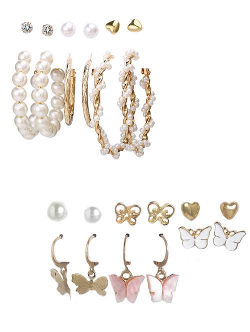 combo of 12 pair pretty gold plated pearl heart studs and hoop earrings