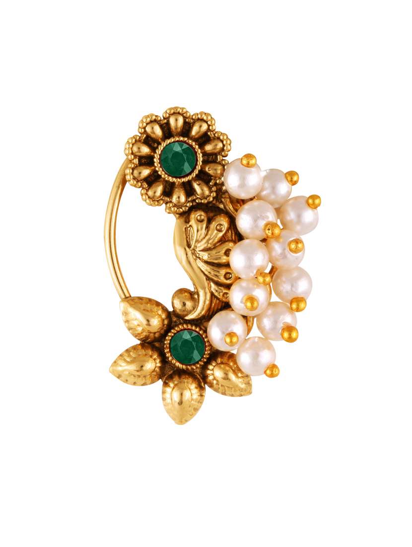 Pearl Alloy and Artificial stone Non Piercing Maharashtrian Nath Nathiya./ Nose Pin for women {VFJ1180NTH-Press-Green }