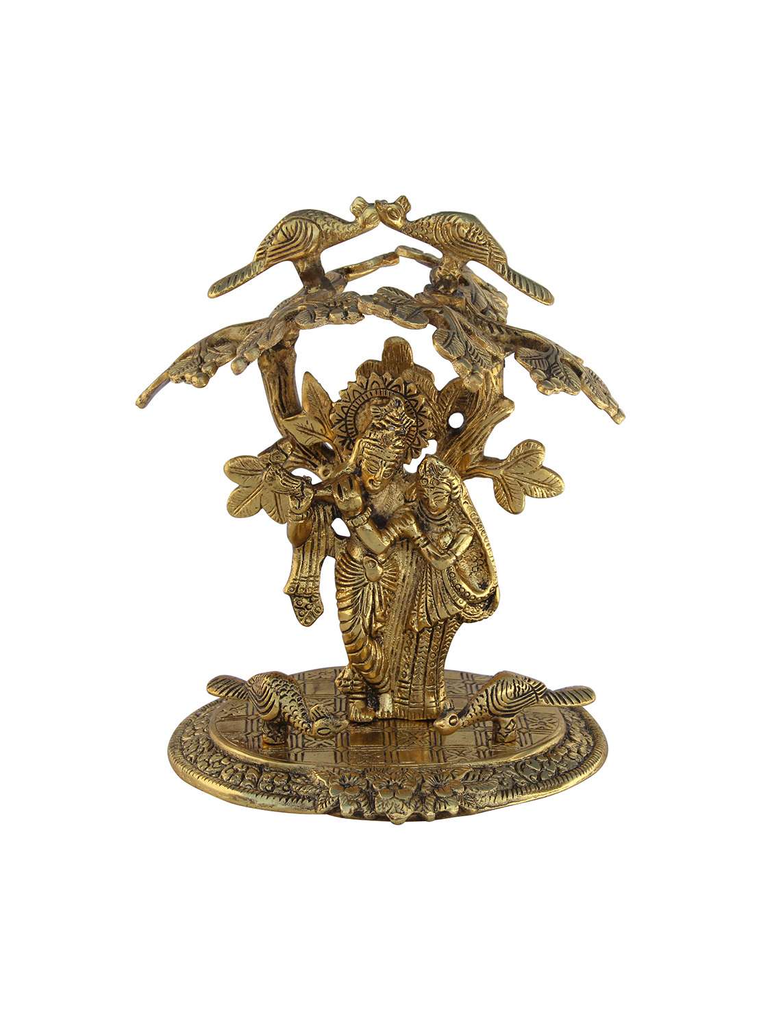 - » radha krishna playing flute standing under tree surrounded by peacocks antique golden