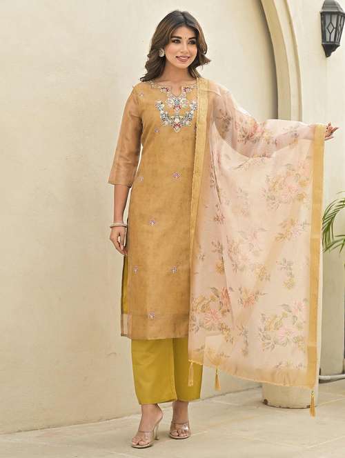 - Find gorgeous sets of ethnic wears in trending designs in gold colors suitable for festive wear of occasions.